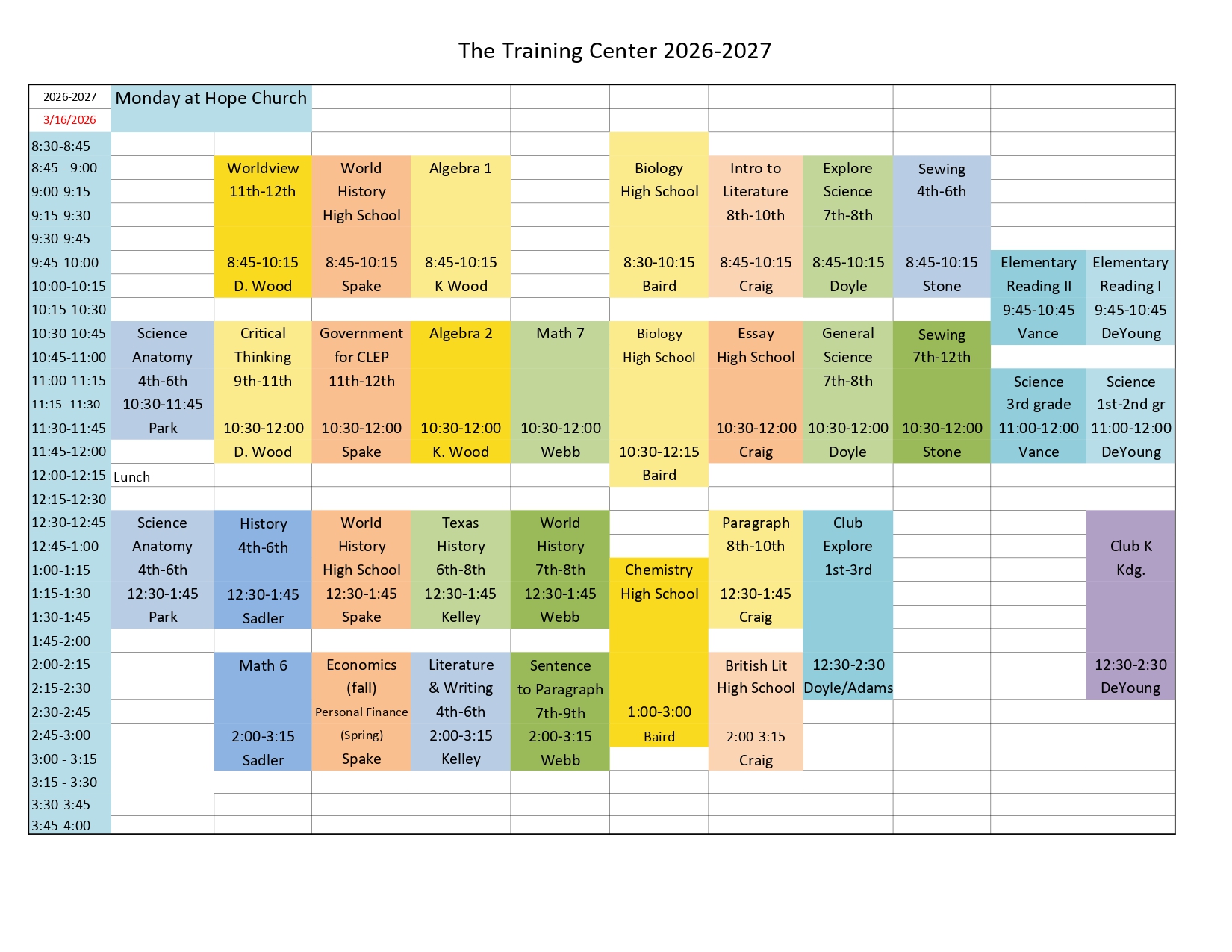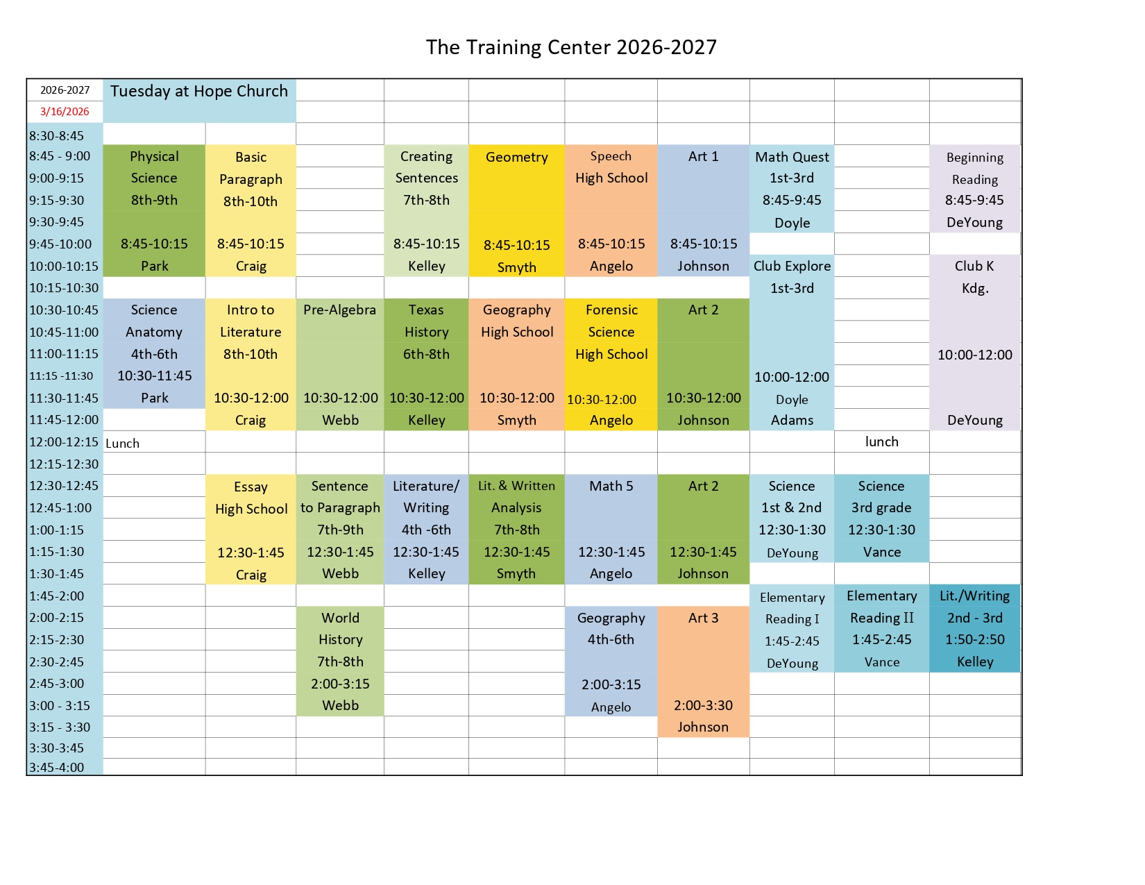 Printable Schedules and Calendar - Open Here NEW SCHEDULE Monday 2026-2027 NEW SCHEDULE Tuesday 2026-2027 Calendar for 2026-2027 Monday Classes for 2025-2026 Tuesday Classes for 2025-2026 Calendar for 2025-2026